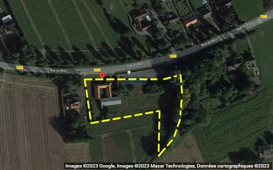 En pointillé jaune, le contour approximatif du site de la ferme Courcol. La CABBALR voudrait récupérer aussi le dépôt de gravier de la DDE le long de la rue du Bois.